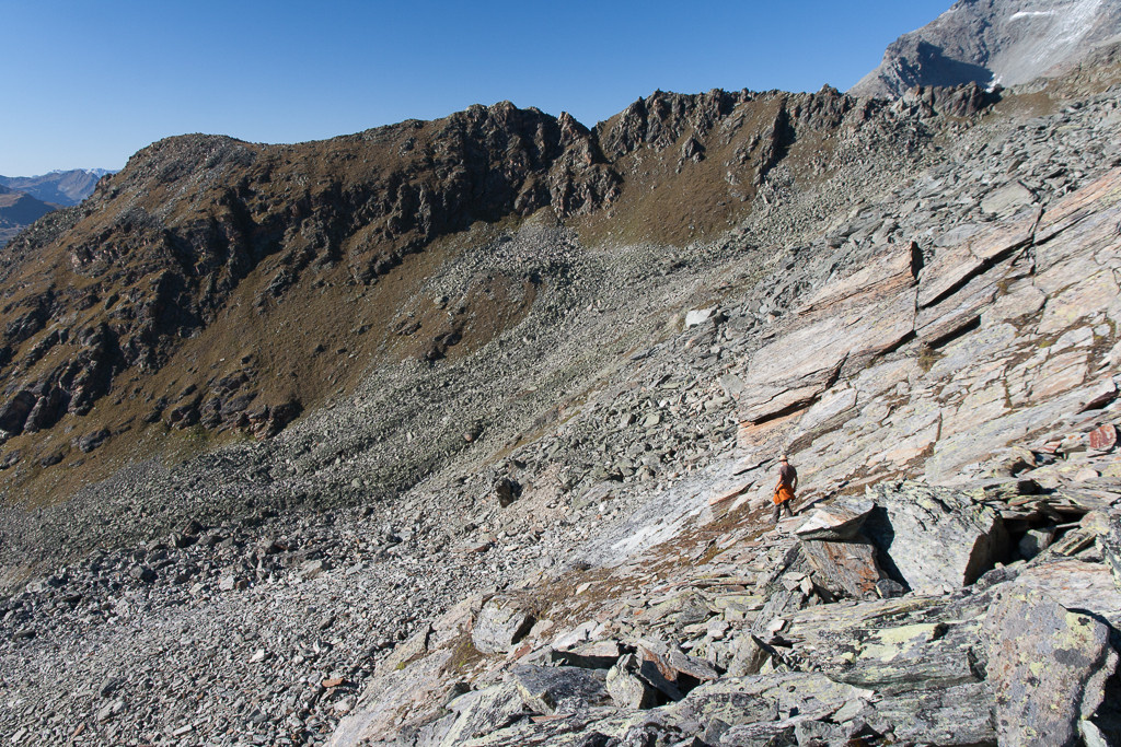 Abstieg durch Schutt und Geröll.