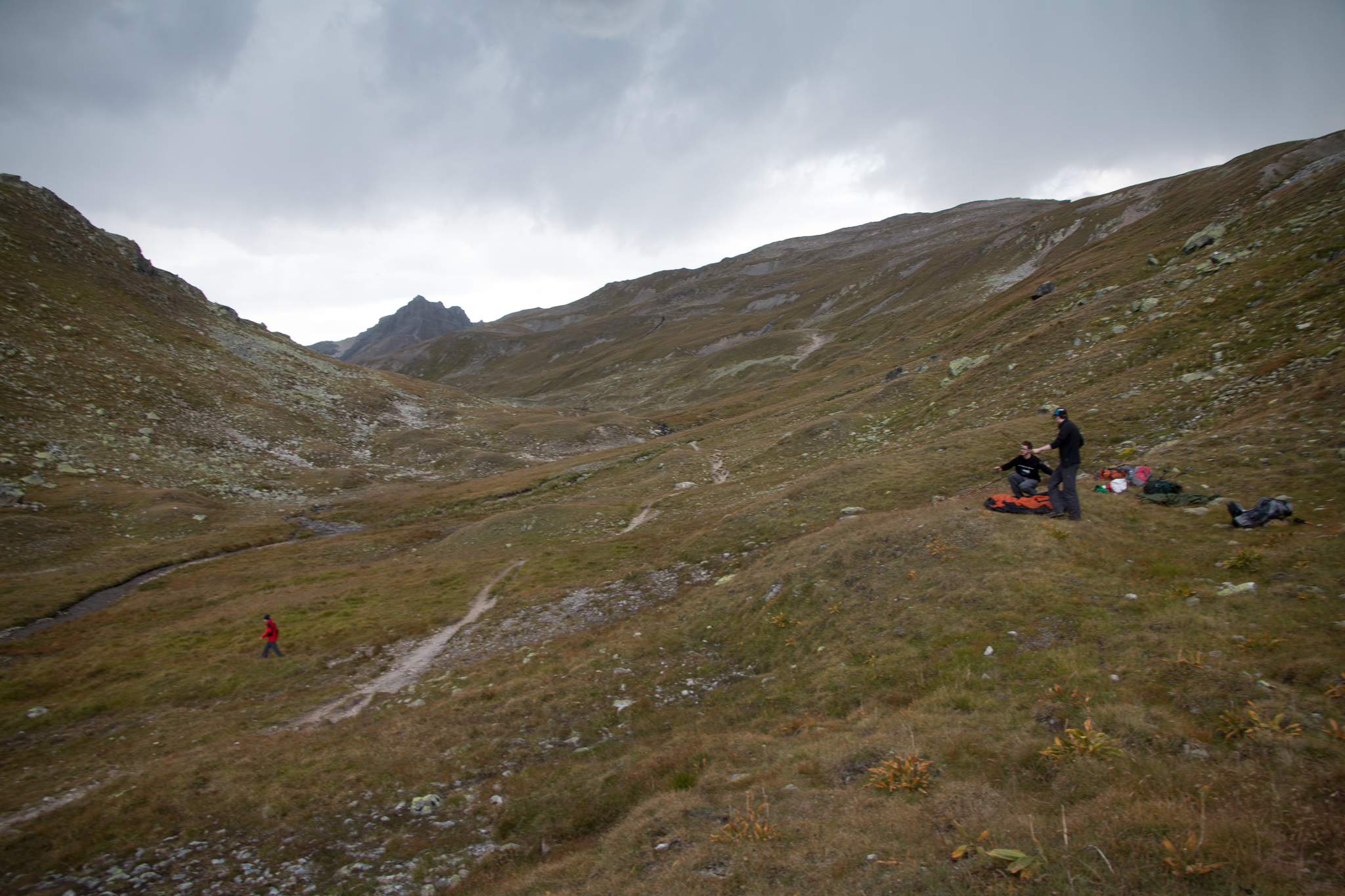 Kurz darauf naht ein Gewitter. Höchste Zeit das erste Zelt aufzubauen.