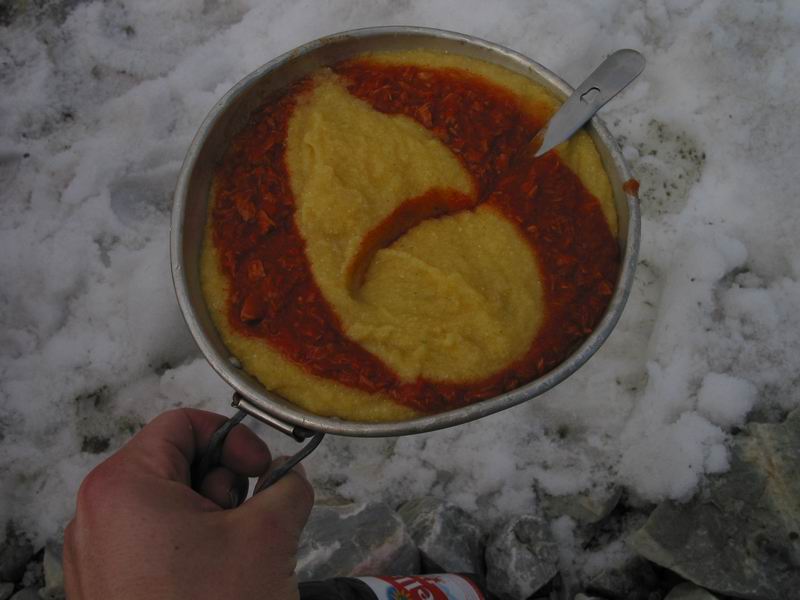 Hmmm, fein. Polenta mit Tomaten-Thon-Sauce. Das bislang mit Abstand beste Essen auf einer Pelikan-Bergtour.