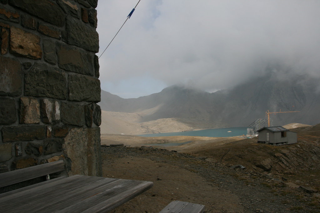 Die Bergstation der neuen Transportbahn ist noch im Bau. Der Muttsee soll rund 30m zusätzlich aufgestaut werden.