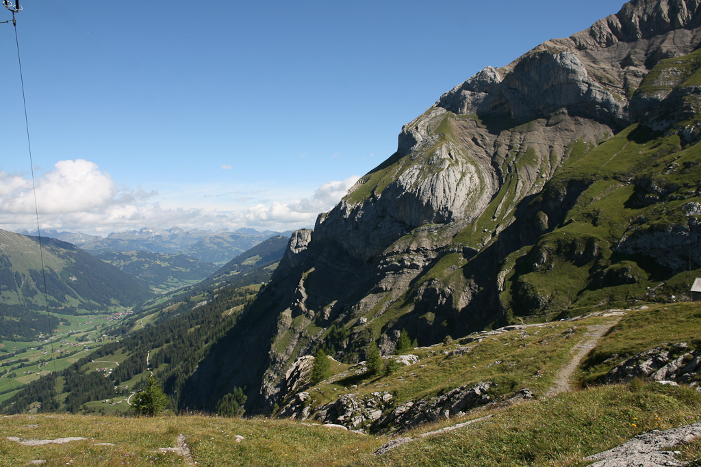 Blick von der Bergstation der Seilbahn hinunter ins Tal in Richtung Gstaad.