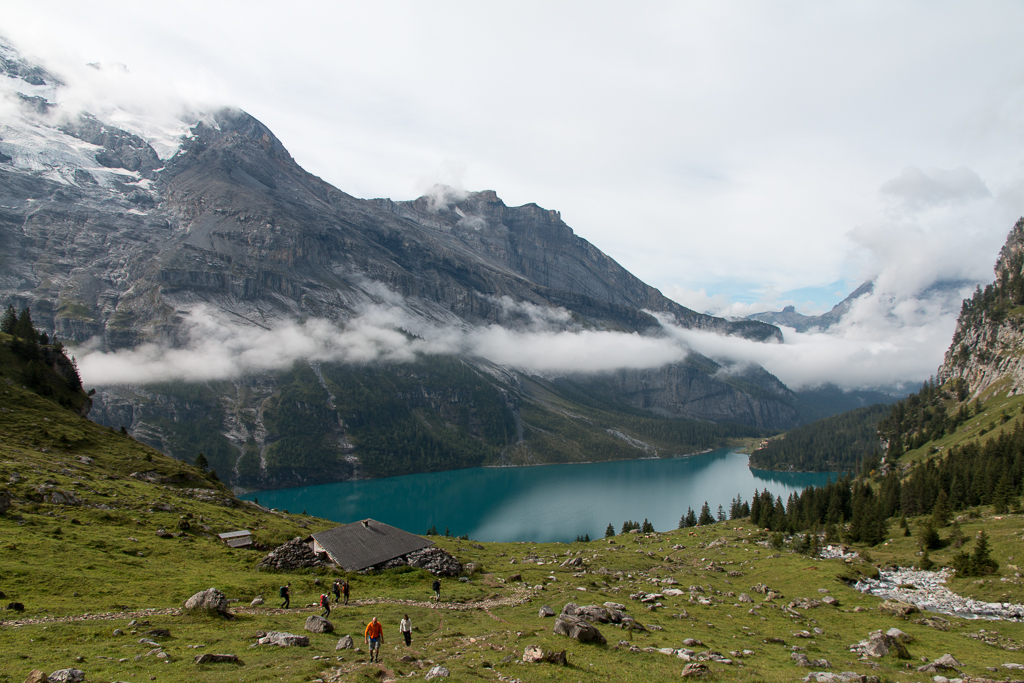Die Wolken verziehen sich und geben den Blick frei auf den Oeschinesee.