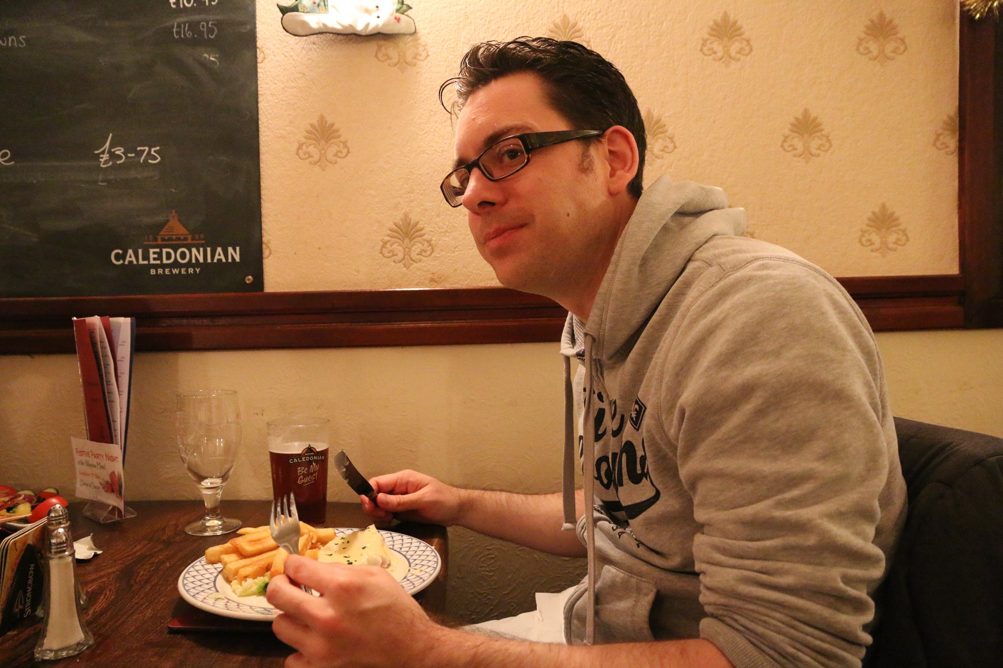 Marc wählt klassisch Fish & Chips.